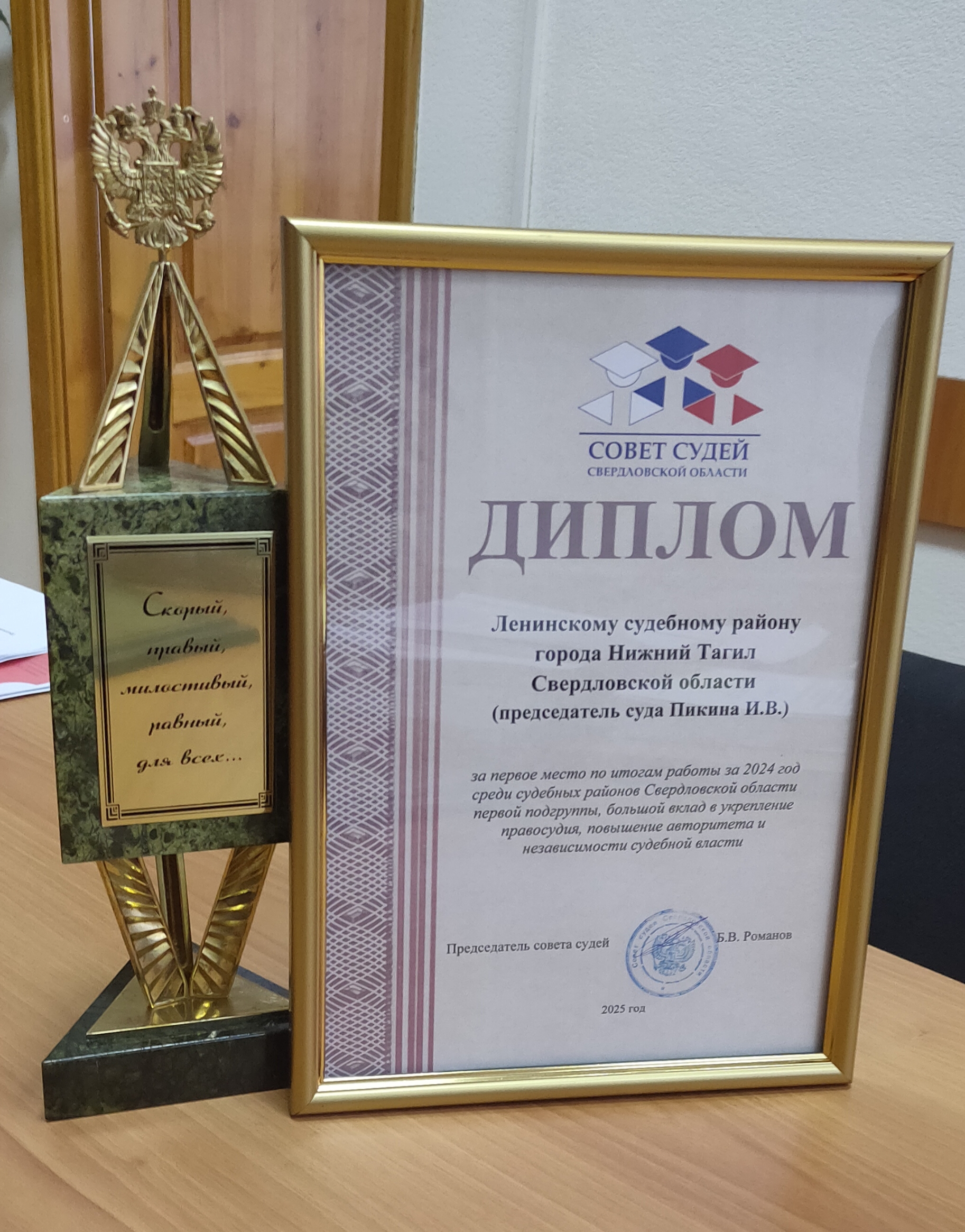 На совещании по итогам работы районных, городских судов и мировых судей Свердловской области за 2024 год Ленинский районный суд города Нижний Тагил был награжден дипломом Совета судей Свердловской области за 1 место сре