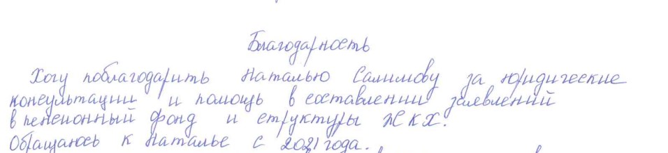 Большую благодарность написала жительница Екатеринбурга Ольга Фомина в адрес юристов Центра защиты прав граждан "СПРАВЕДЛИВАЯ РОССИЯ" Свердловской области. Женщина уже более трех лет сотрудничает с ЦЗПГ, консультируется по разным вопросам. На днях она решила поблагодарить весь коллектив Центра и, в частности, юриста Наталью Салимову. Именно к ней Ольга приходит в случае любой проблемы.
