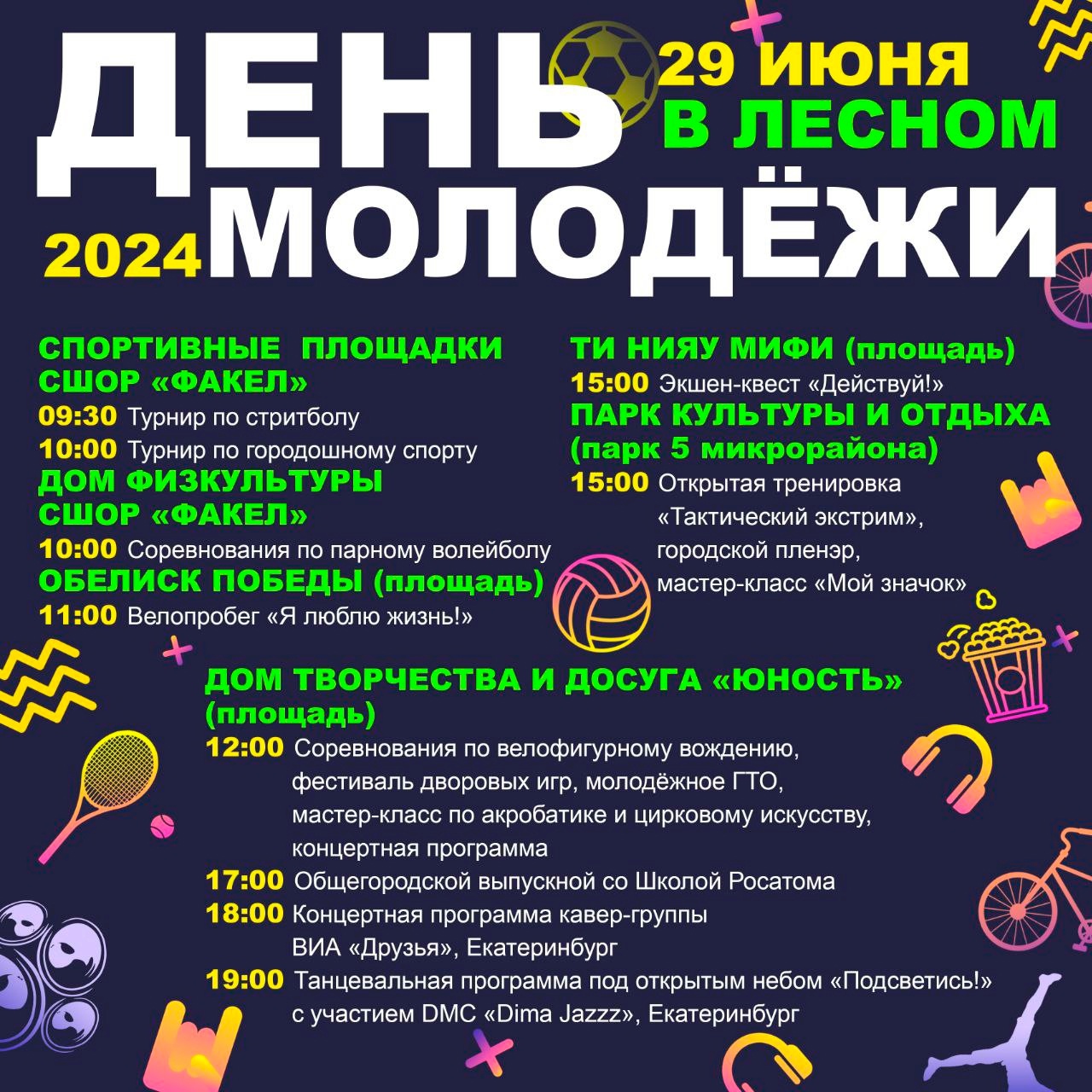 29 июня в Лесном отпразднуют День молодежи. Публикуем афишу мероприятий.