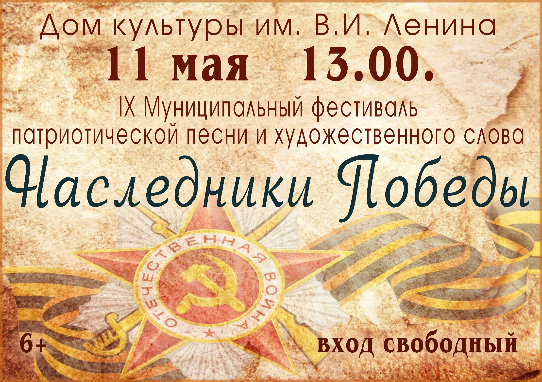 Дорогие земляки! В Доме культуры им. В.И. Ленина пройдет IX Муниципальный фестиваль патриотической песни и художественного слова "Наследники Победы"
