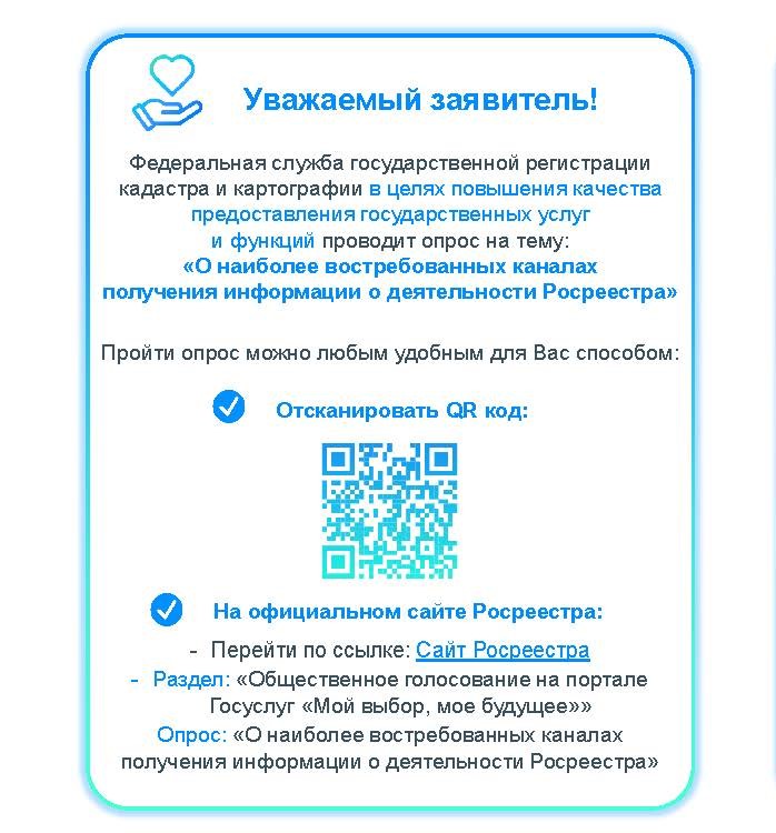 Опрос размещен на главной странице официального сайта Росреестра в разделе «Общественное голосование на портале Госуслуг «Мой выбор, мое будущее»», опрос: «Оценка удовлетворенности внешних клиентов доступом к информации о деятельности ведомства». К опросу также можно перейти по QR – коду (прилагается) или по ссылке: https://pos.gosuslugi.ru/lkp/polls/407564/ .